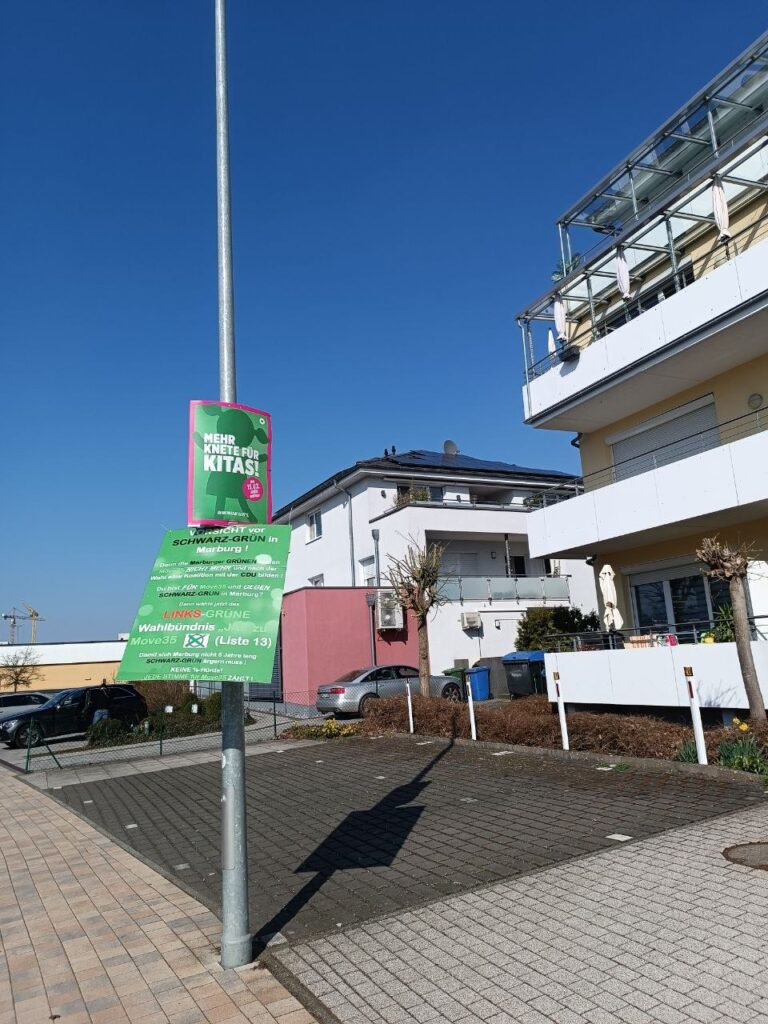 In der Stadt Marburg kam bei dieser Wahl etwas Neues hinzu. Die bisher durch die Marburger Verwaltung großzügigerweise getragenen Kosten für das Plakatieren an den Stellwänden konnten nicht mehr übernommen werden. Es muss vermutet werden, dass dies mit der allgemeinen finanziellen Schieflage zusammenhängt, was letztlich auch auf den Kriegskurs unserer Regierung zurückzuführen ist. Und einfach so ein Sondervermögen aus dem Nichts zu zaubern – sagen wir einmal ganz bescheiden 3 Mio. Euro -, klappt aus „unerfindlichen“ Gründen in diesem Zusammenhang wohl nicht.
